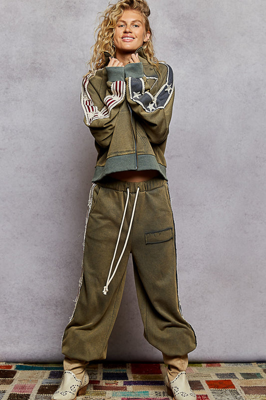 Designed in long sleeve roomy fit jacket in French terry with varied striped elastic and thermal trim tape, lace-bordered accents, and star patch detailing.