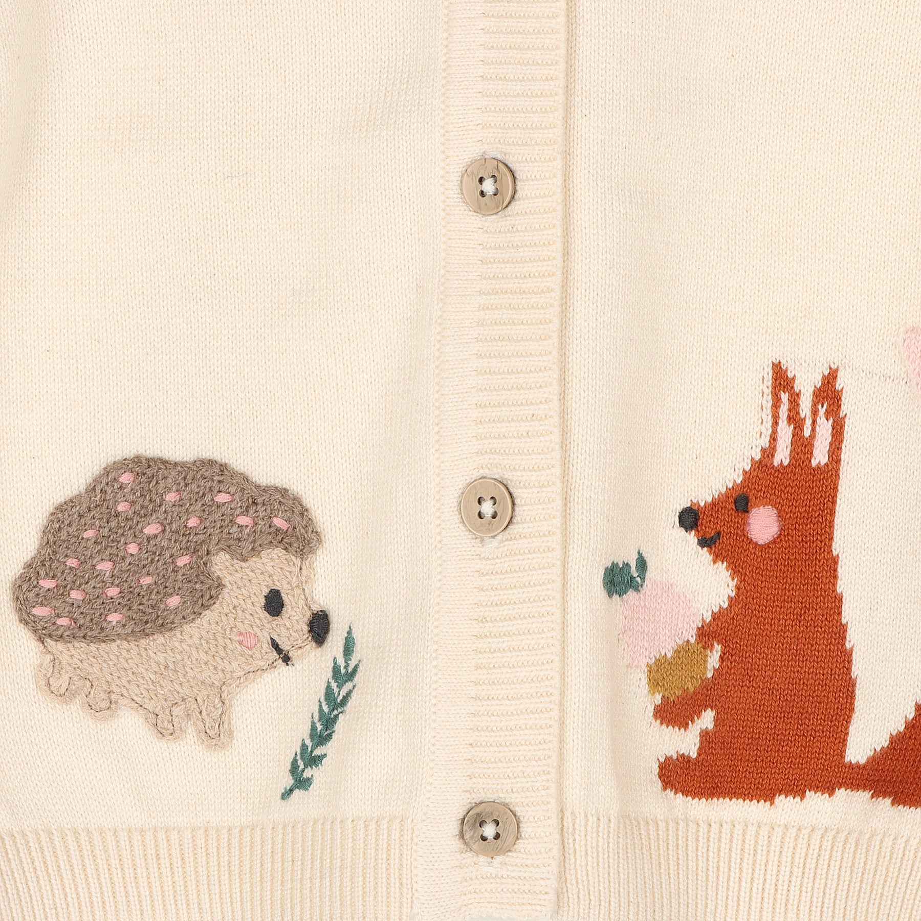 Introduce your little one to woodland charm with this delightful Forest Friends Baby Cardigan. Crafted from 100% organic cotton, it's gentle on sensitive skin while keeping your baby cozy and comfortable. The long sleeves provide extra warmth, while the convenient button-front closure makes dressing effortless. Featuring an enchanting jacquard design showcasing a squirrel meeting a hedgehog, complemented by charming applique details, this cardigan brings storybook magic to everyday wear. Perfect for layering or standalone styling, it's a wardrobe essential that combines softness, durability, and whimsical design your little girl will love.