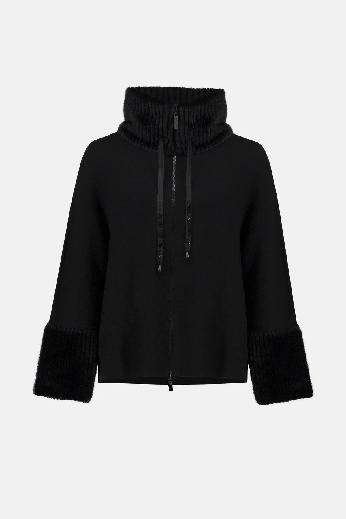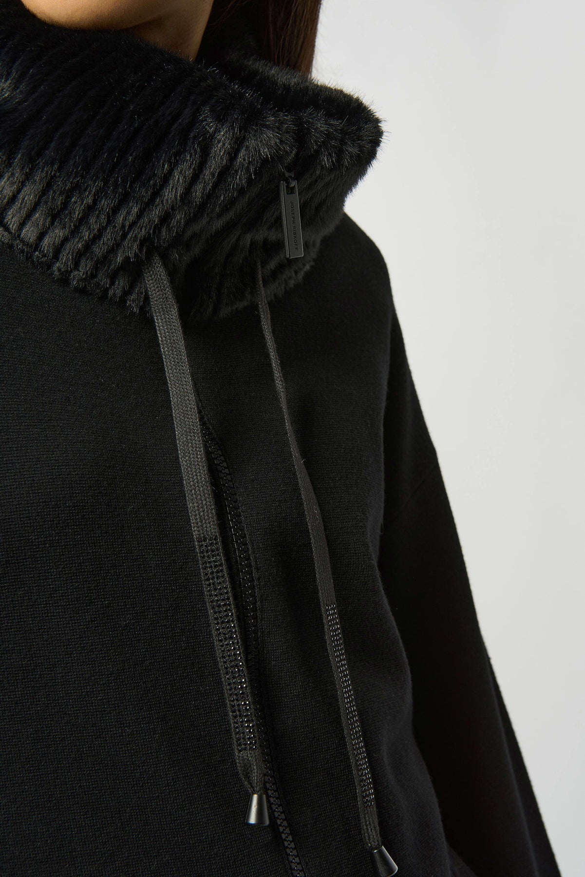 Stay warm and stylish with the Urban Frost Jacket, featuring a cozy sweater knit body and luxurious faux fur trim. Its mock collar and long straight sleeves provide extra coverage, while the front zipper closure ensures easy wear. Rhinestone drawstrings add a touch of sparkle, making this unlined jacket perfect for layering on chilly days. Elevate your winter wardrobe with this chic and comfortable essential.