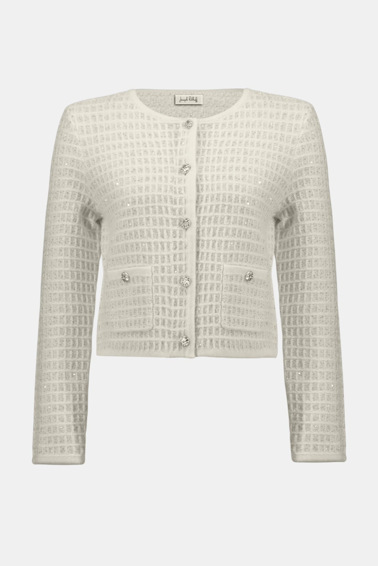 Elevate your wardrobe with the Monaco Moment Knit Cardigan, where sequined yarn and polished golden buttons create an elegant shimmer. Designed with a timeless crew neck and sleek long sleeves, this cardigan features chic front pockets detailed with golden buttons for a refined finishing touch. Perfect for adding a sophisticated sparkle to any outfit.