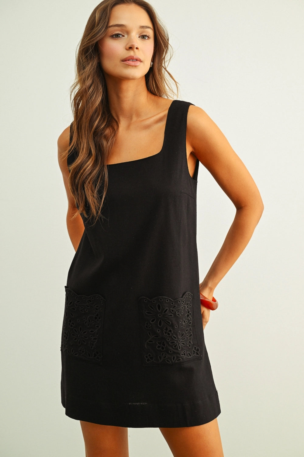 Simple, structured, and effortlessly polished, this square neck linen dress is the kind of piece that works for just about anything on your calendar. The clean neckline and relaxed shape create a flattering silhouette, while the eyelet pockets add a subtle, feminine detail that sets it apart.