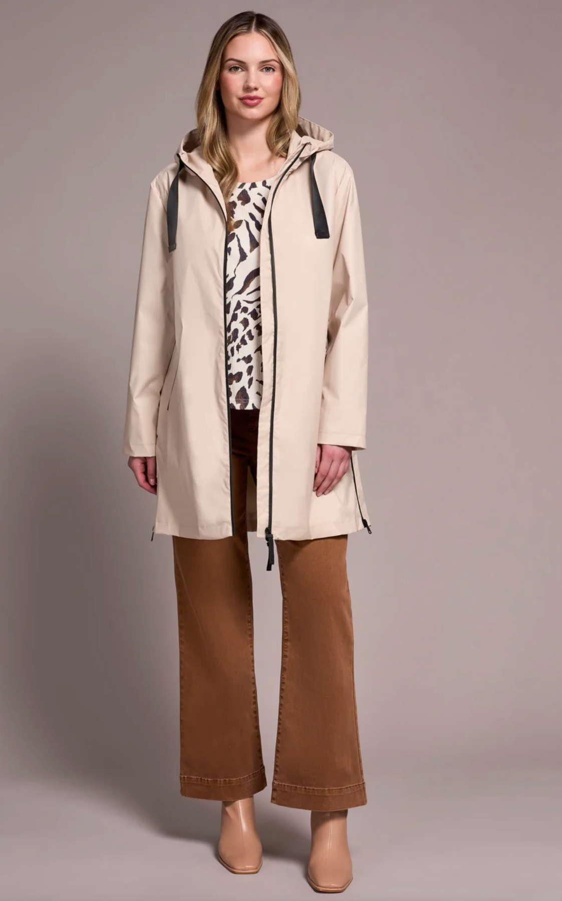 Stay stylish come rain or shine with the Rain Reveal Jacket. This light taupe raincoat surprises as it transforms when wet, revealing a fun plaid print on the outside. Made with Stormie Hydro Chromatic water repellent technology, it keeps you dry and adds a splash of playful personality to gloomy days. Perfect for those who love a twist in their outerwear!